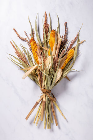 A beautiful hand-tied wall-hanging arrangement of 3 maize cobs with stems of maize flowers and leaves, tied with rustic hop twine.
